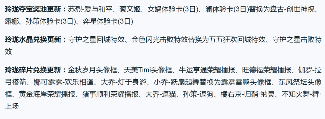 因为我没有抢先服,所以不确定之前抢先服更新后,比如玲珑夺宝、碎片商店之类的是否有更新,反正之前更新公告中是没有提及的。不过新赛季大版本更新,能提及的内容肯定不止这一些,一些小的可有可无的改动,还是需要自己去细心发现。希望这一次的大版本更新,BUG问题少一点。之前大版本更新,BUG问题一大堆,被无数玩家骂,这一次应该长点心了。