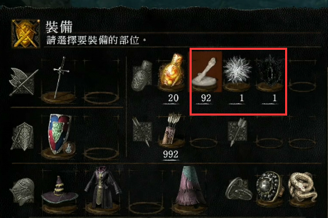 首先,需要将想要卡BUG的消耗道具装备到快捷物品栏,目前已知可以卡BUG的消耗道具分别是返回骨片,防火女的灵魂,各种BOSS魂,其他的消耗物品我没有试过。左右手都要装备上武器,如果右手是装备着短剑刺剑之类的轻武器,那么务必在卡BUG时候要双持轻武器,单持是卡不出BUG的,而如果右手是装备着黑骑士钺或者恶魔大斧之类的较重的武器,那么可以不双持,单持也可以卡出BUG。