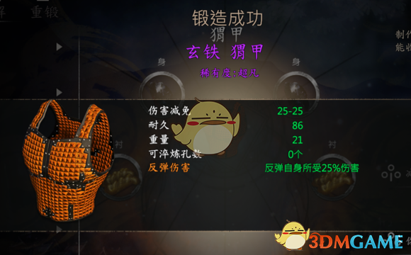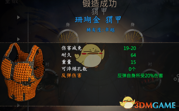 珊瑚金猬甲:2珊瑚金,1黑虎皮,1红斑鳄鱼皮。(两个珊瑚金加两个卓越的兽皮。珊瑚金是除了玄铁硬度最高的金属,相比较玄铁打造出的装备质量又轻,性价比很高。在先民遗迹商队死尸上能找到两个。兽皮用兽王的皮。)