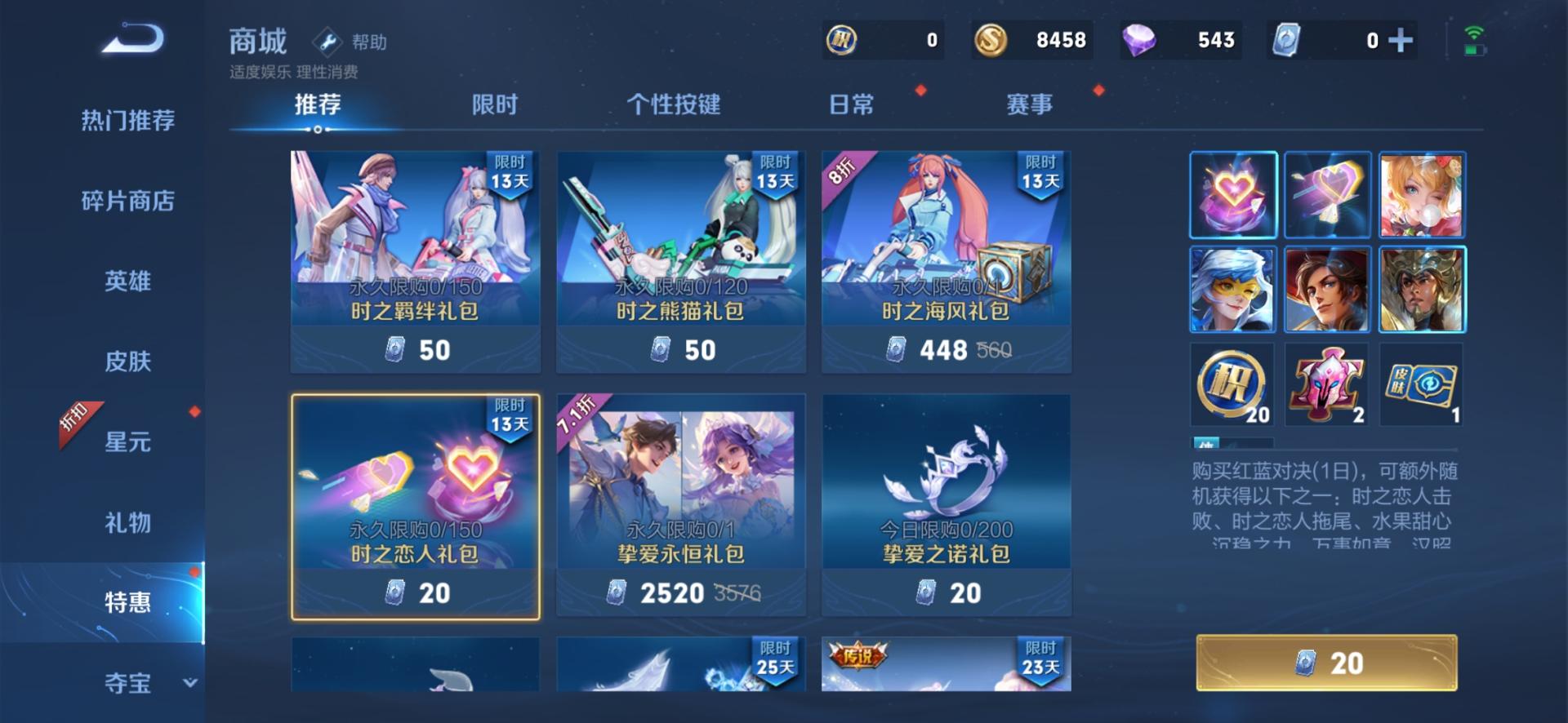 大家可以看一下王者荣耀商店中展示的特惠推荐,这眼花缭乱的各种大礼包真的是非常多,除了孙策大乔520的专属皮肤之外,官方在本次更新中又新增了四大礼包。