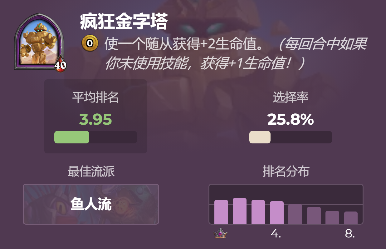 万年垫底的英雄疯狂金字塔在炉石传说23.4.3补丁迎来一波重做,技能从随机变成指定,Buff效果降低但可以成长。在版本首日,大家对它的理解还不足,比如我自己玩了以后就发了一篇它还是很弱的文章:它的技能也就前期吃烂分,后期得配合特定流派保护随从才强。事实确实如此,但它的平均名次却很出人意料,全分段3.95。