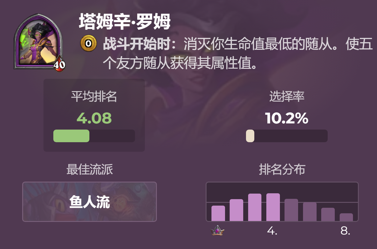 炉石传说23.4.3补丁中得到增强的另一位英雄塔姆辛·罗姆的表现也很不错。她之前是倒数行列的英雄,现在一举冲到了T2前列,高分段甚至是稳定的前三名。塔姆辛比疯狂金字塔更加极端,把吃烂分发挥到了极致,三四名的概率极高,吃鸡和速八的概率极低。