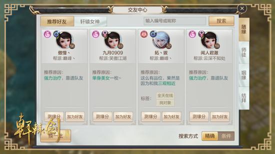 《轩辕剑online》手游从玩家进入游戏开始便以后台大数据记录你的游戏习惯,并以此为基准进行缘分测算,为你匹配最适合自己陌生人。每一次匹配对于两个人来说都是独一无二,趣味判词也将成为破冰聊天的共同话题,撩妹/汉高手就是要自然而又不露痕迹的开启话题,拒绝尬聊!