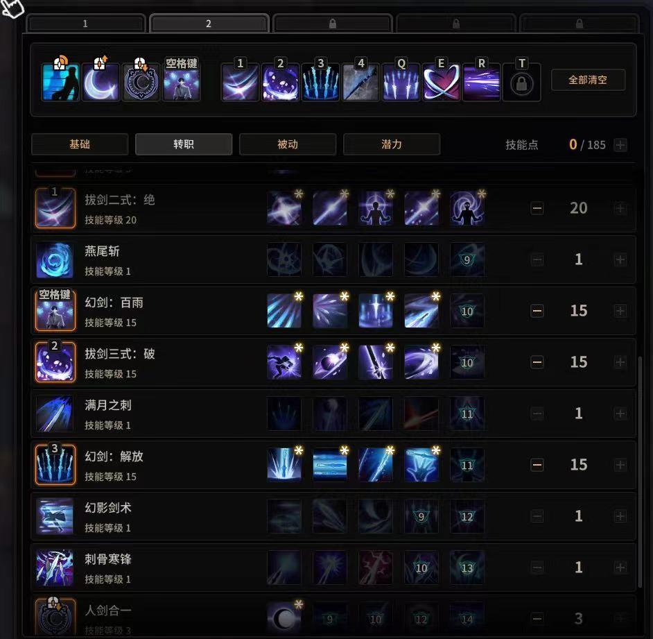 和大部分的职业一样,幻影之刃的基础技能没什么好点的,过度的话也尽量选择加转职技能,毕竟前期已经是很弱势了,点了基础技能就更刮痧,转职方面优先将新月战击、拔剑一式:疾、幻剑:天疾、拔剑二式:绝点满,这个几个技能都是在中期的时候就能学会的,点满的目的就是让我们清怪的速度更快。