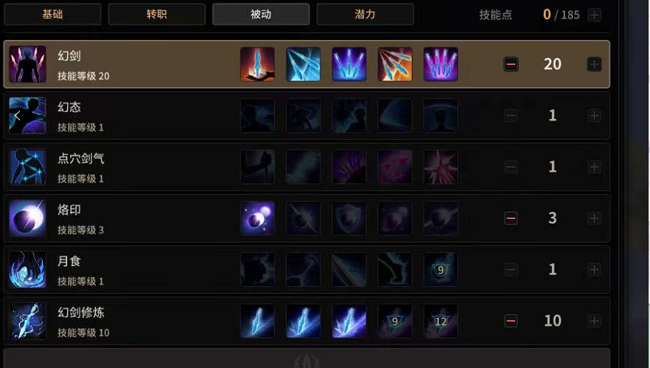 被动这一块和网上教学都差不多,幻剑这个技能拉满,幻剑修行给10点,烙印给3点(这个技能要是不点的话,后期打boss略微刮痧)。