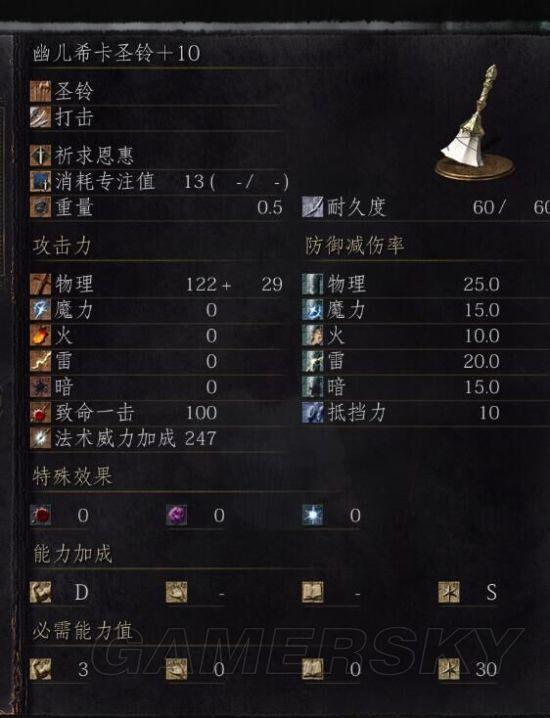 首先是圣铃选择,这个毫无疑问要选最好的,那就是幽儿希卡团长大人赠送的圣铃,这法术威力加成在高信仰下是最好的。一般40信仰以上,完全发挥是60(获取方法:点击进入)。
