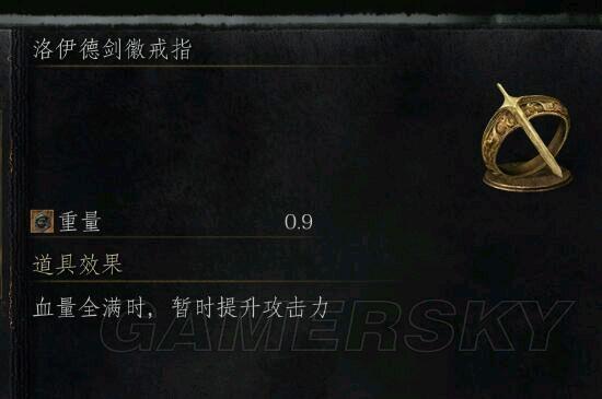 剑徽戒指,加伤害的戒指,满血时会加10%攻击力,红泪是20%,用了红泪游戏就变成了魂斗罗,加大了游戏难度,而相比于红泪,剑徽加的攻击没红泪多,但是对于不追求极限输出的玩家来说是一个安全稳妥的选择。