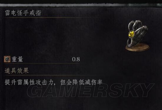 雷系的套路就是:金石之誓+幽邃庇护+雷电剑+雷之怪手戒指,金石、庇护和雷电剑的效果自不必说,而雷之怪手的效果就是增加15%的雷属性属性伤害,60信仰下就是35点,效果还是不错的。