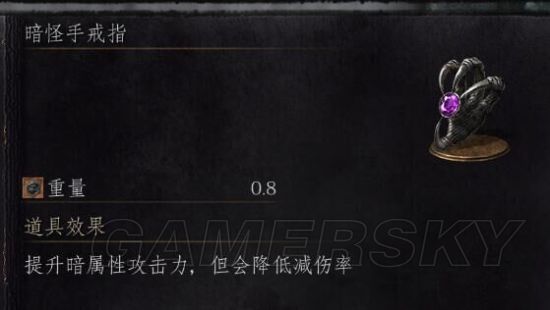 暗系的套路就是:金石+幽邃+黑剑+暗之怪手戒指,同样的,暗之怪手的效果是增加15%的暗属性属性伤害。