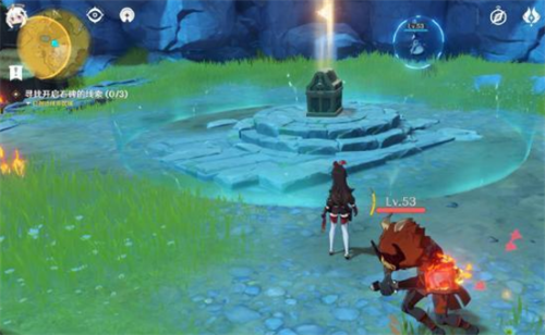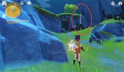 第二处在正东边,被一个结界保护着,周围也有一群丘丘人,收拾完过后拿到第二个线索和宝箱。这里一定要回去交线索,第三个线索要打碎一种黑色的石头拿星星去解谜石柱,如果有线索在身上会冲突;