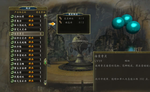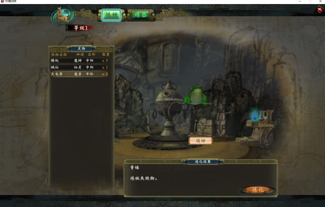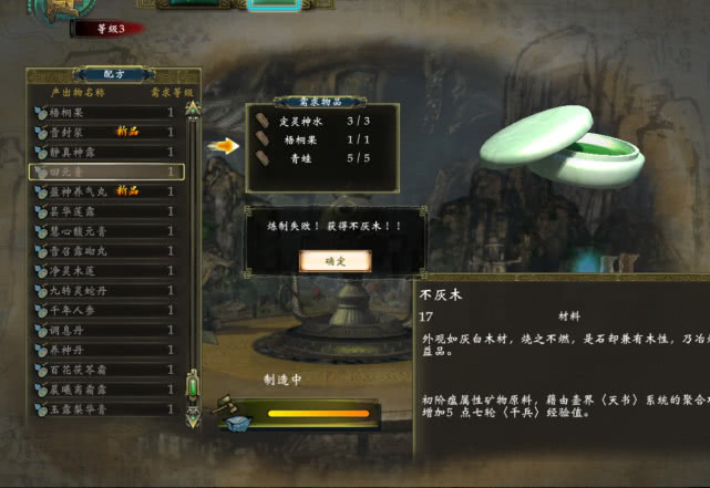 准备好所有的材料之后,先不要急着去制造“慧心馥元膏”,我做这个任务时候的炼器等级不高,只有4,失败几率是非常非常大的。所以,在制造之前,一定一定要先存档!再说一遍,先存档!对,材料准备好,先存档,如果失败了重新读档再制作一次,我第一次没有存档,只准备了5只青蛙,失败之后又跑出去捉了10只妖怪,心都快碎了。