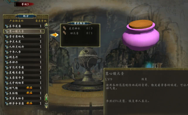 下面我们来看看这条支线,我接的是清儿的任务,清儿一上来就管我要一个叫做“慧心馥元膏”的东西,我在朝歌的药铺看了好久愣是没找到,心想这东西去哪儿找啊?后来才想起来,我们有炼妖壶可以制造呀,果然在炼妖壶里找到了这个叫做“慧心馥元膏”的药品,既然有配方,剩下的就是找到材料做出来就好了,我们现来看一下“慧心馥元膏”需要什么材料。