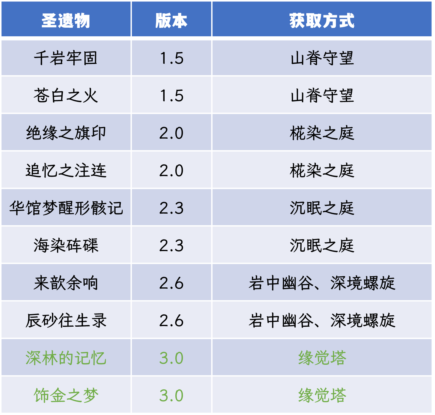 3.0版本无法通过合成获取的圣遗物列表,其中绿色字体为3.0版本新增的圣遗物套装。