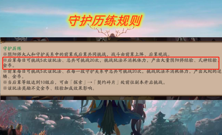 各位小伙伴们大家好啊,在这里先祝大家每日一抽都能出未收录。阴阳师作为国内二次元手游的老大哥一直都在社交这一块下功夫,而要说阴阳师中社交的集大成者是谁那一定得说是师徒系统。最近阴阳师官方又对师徒系统进行了一波调整,这次新增了一个一天可打出100金蛇皮的的心小活动—守护历练。