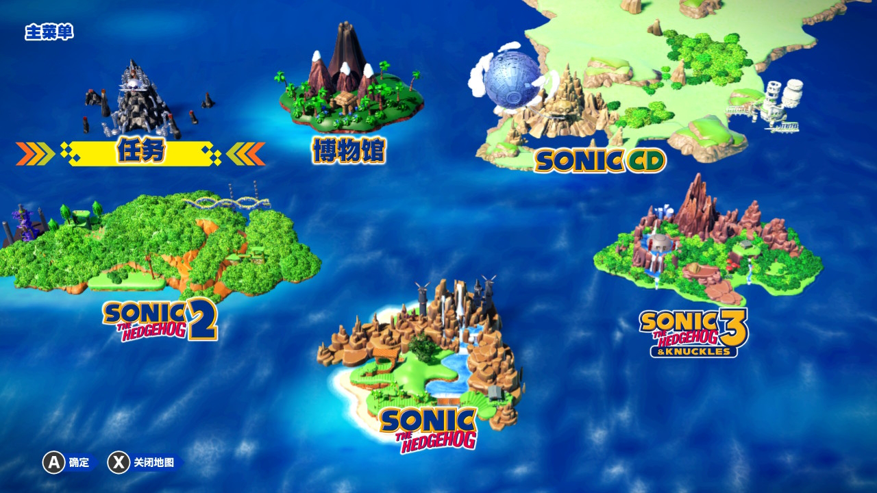 比如,《索尼克:起源》在游戏界面中可以打开的地图菜单,会将历代四款作品平铺在玩家眼前,给予玩家较为直观的视觉效果,并且玩家可以任意放大观察3D岛屿的建模细节。
