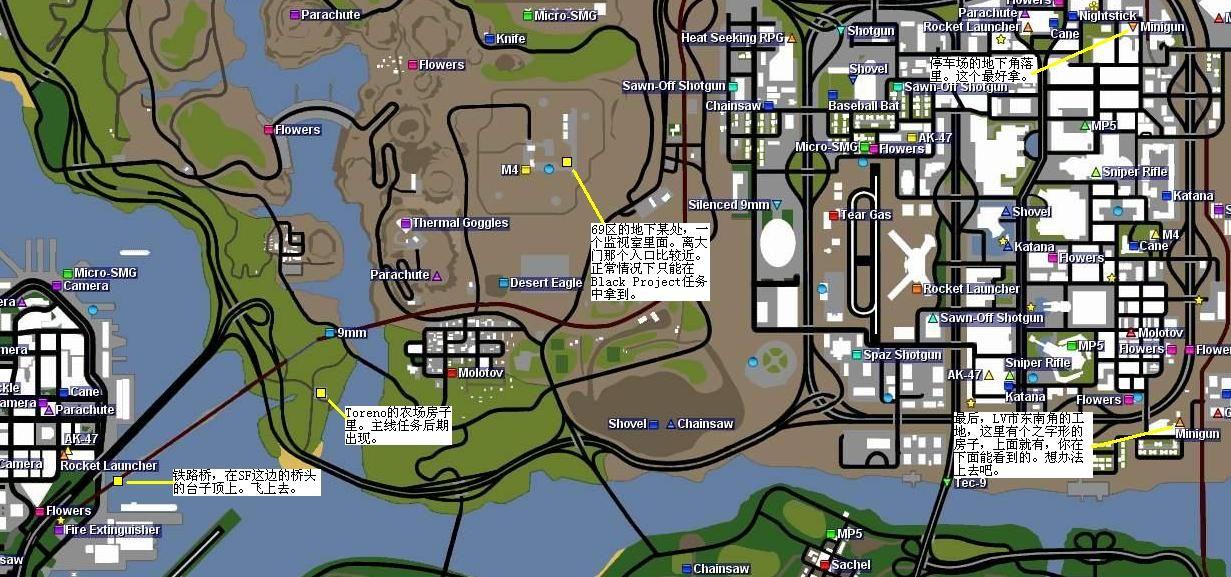 《侠盗猎车:圣安地列斯》中的武器中的武器种类有很多,除了在武器店买之外,地图上还有很多的武器等待着玩家寻找,比如米尼岗、火箭筒等,具体位置如下所示,图片下方有标识这些武器的中文名都是什么。