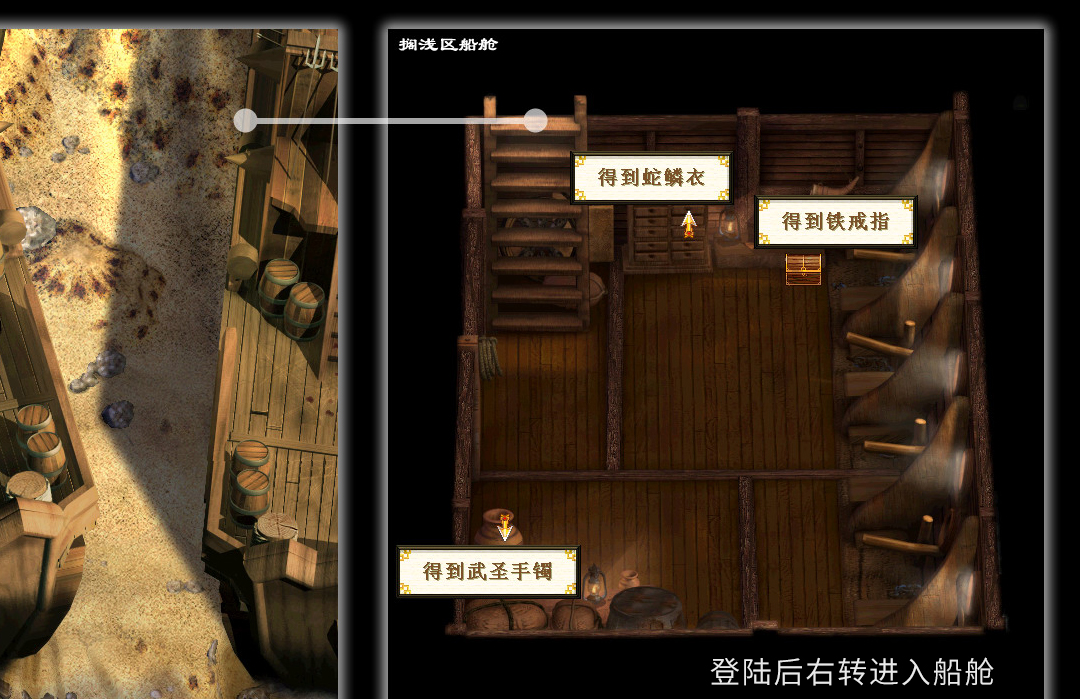 海战(经过几天的航行,在海中碰到威尼斯水军和骑士团的交战)流程:与“护民官”对话→与康那里士对话→凭空出现岛屿→追寻水军下船登陆(下船后右边船舱有铁戒指、蛇鳞衣、武圣手镯)。(与护民官的对话回答“帮忙”或“不帮忙”对主线剧情都没有影响,区别在于回答“不帮忙”的话,在船上触发的战斗对象就会多一种类型)