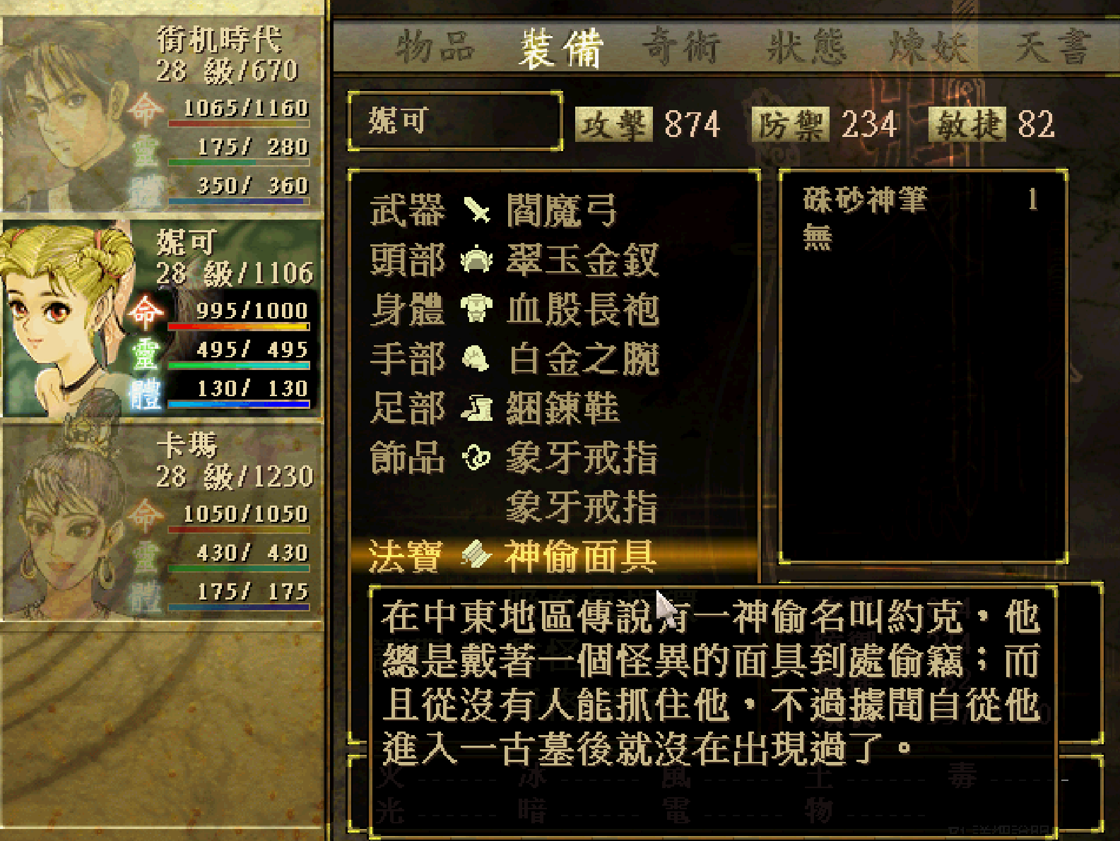 《轩辕剑3》中拥有偷窃指令的法宝是:神偷面具和乾坤袋,在《天之痕》中则是乾坤袋再次出现,“偷”的效果都是一模一样的。