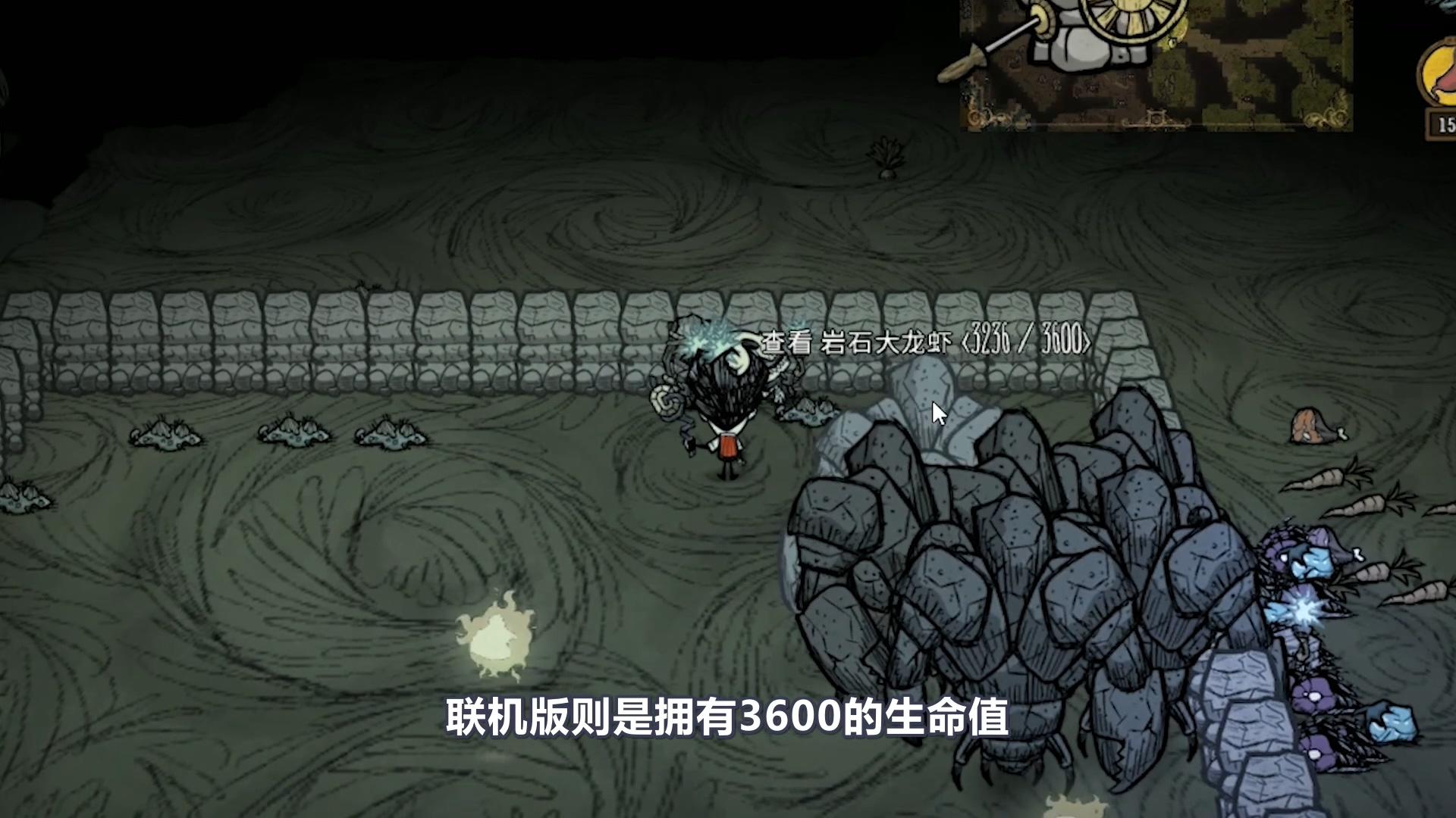 单机版石龙虾最高拥有1800的生命值,联机版则是拥有3600的生命值,它的输出伤害最高能够达到90。当它被攻击时会躲入石头外壳中,此时它可以免疫95%的伤害,并且每秒能够回复10点的生命值。