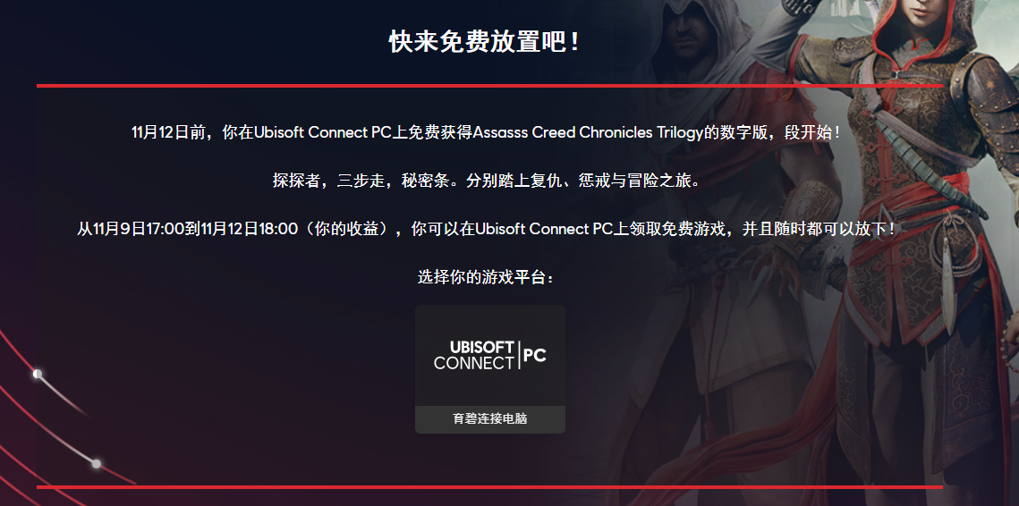 育碧 11.9~11.12 可以领取 刺客信条编年史三部曲