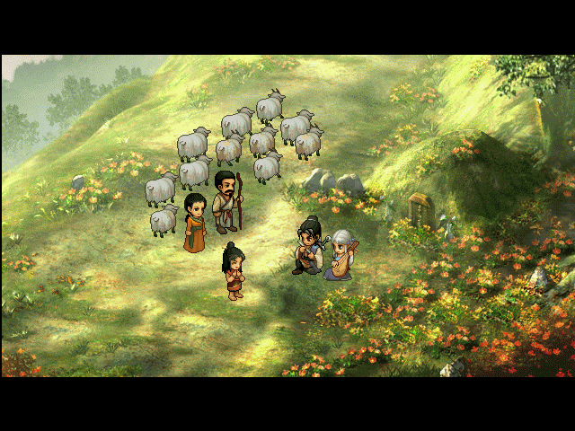 远处走过来一对牧羊夫妇,驱赶着一群羊向山上走去。一个小女孩听到了有人弹琴,蹦蹦跳跳地跑了过来说:“这首曲子真好听。”随手摘了一朵花献给小雪,并安慰雪儿不要哭。