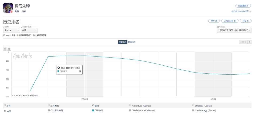 网易推出的战术竞技手游《孤岛先锋》就表现一般。从 7 月 25 日上线至今,它在 App Store 下载榜的最好成绩是第 77 名。