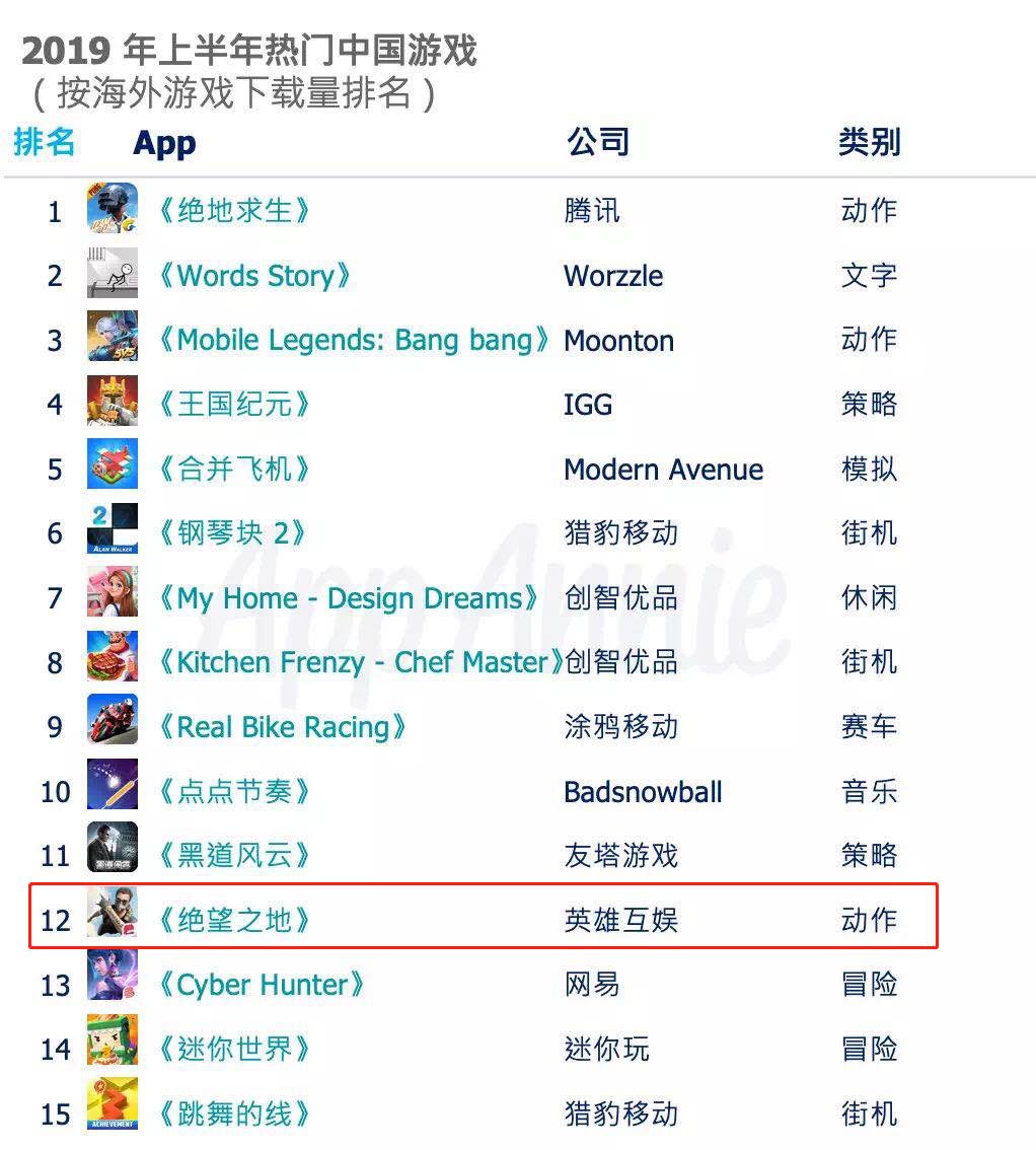 这款产品在海外市场也有所斩获。AppAnnie「 2019 上半年中国游戏出海下载榜」中,英雄互娱旗下的《绝望之地》(即《王牌战争》的海外版,《Hopeless Land》)排在第 12 名。