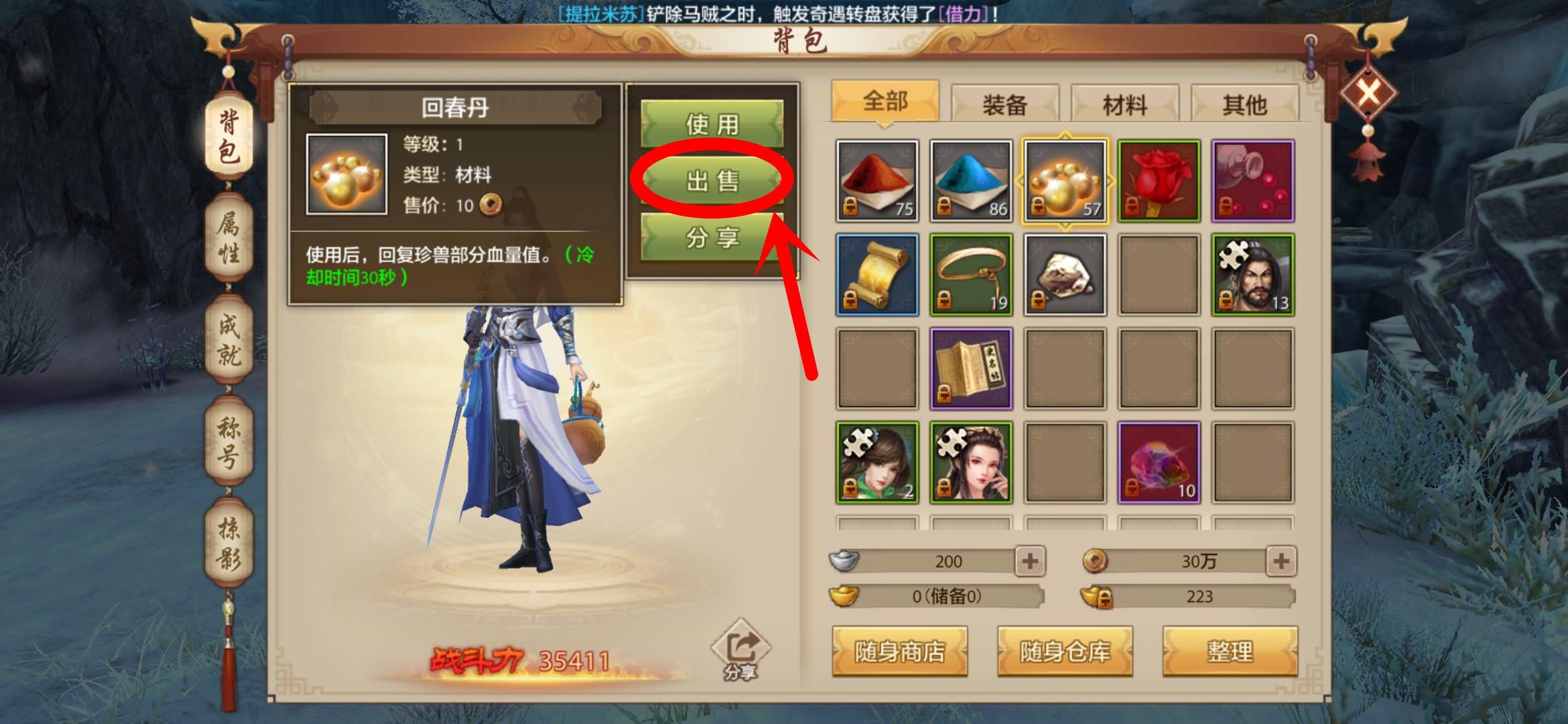 2、选择自己要售卖的材料装备,选择“出售”。
