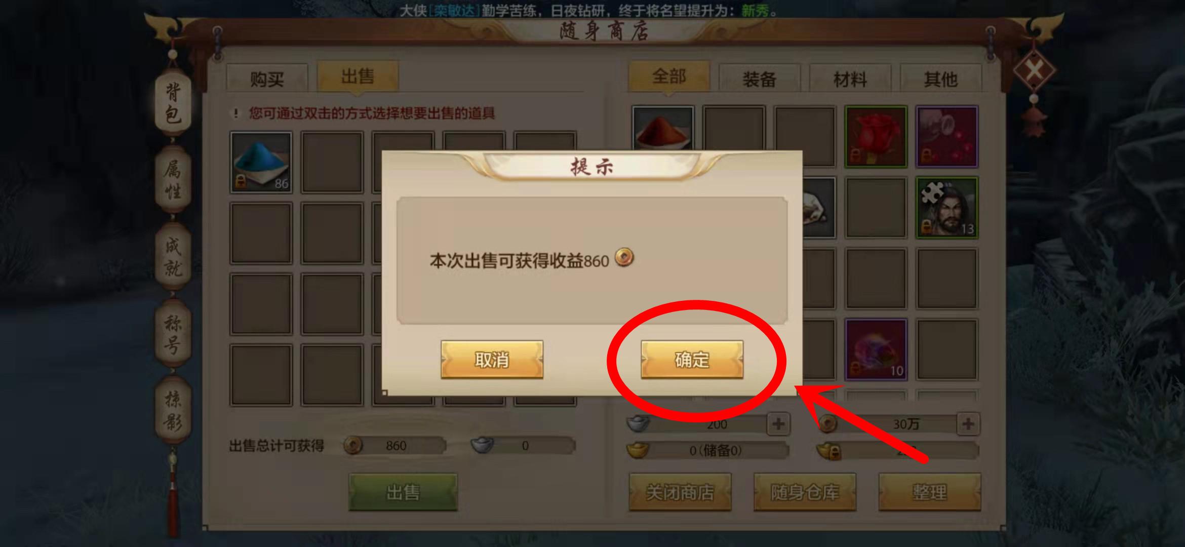 3、然后在该界面里点击“确认”就可以成功售卖出你的材料装备。