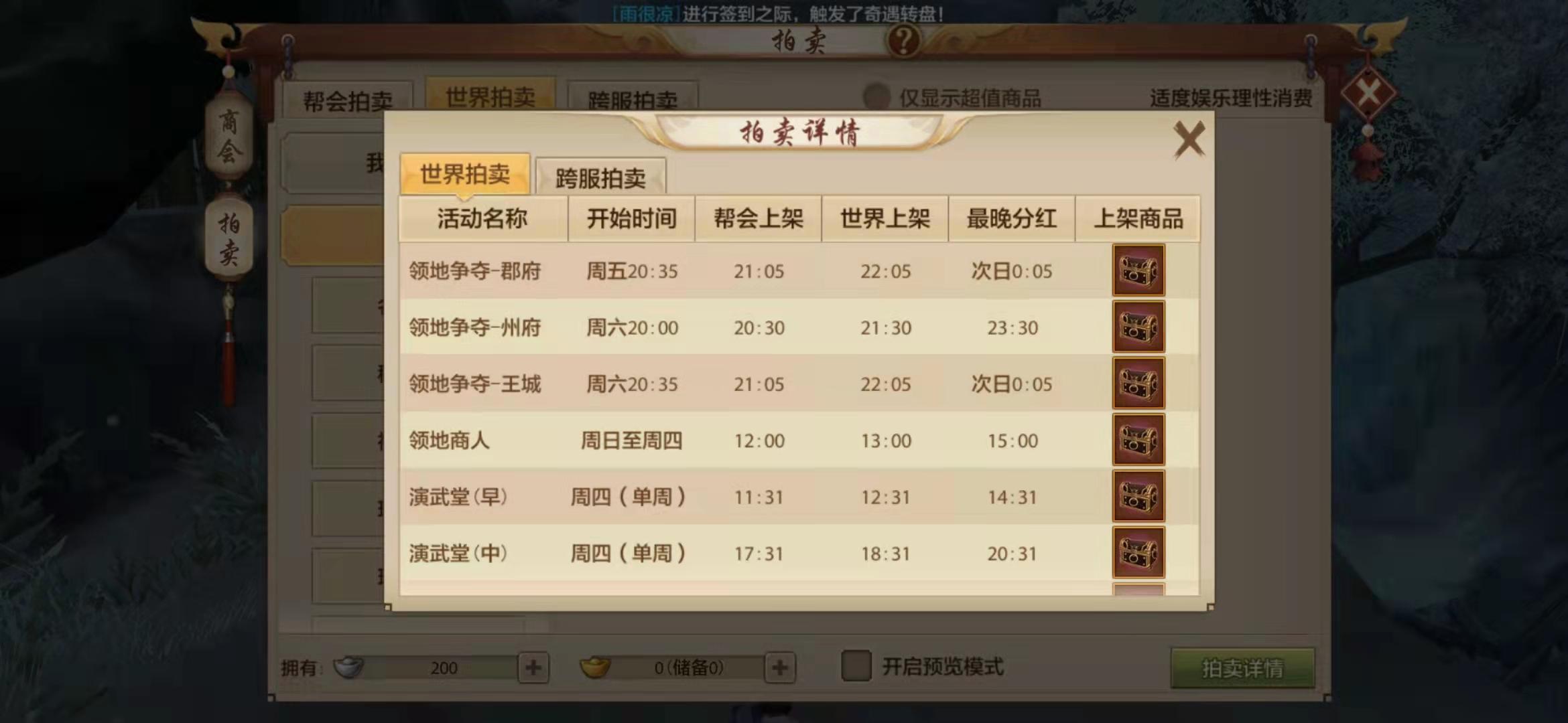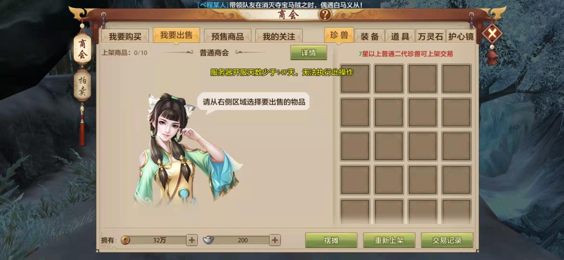 4、另外,想要在交易商会里摆摊和出售物品是有要求限制的,摆摊需要你的服务器开服天数大于147天才可以,而拍卖也是有时间限定的,玩家必须根据上面显示的时间来进行拍卖。