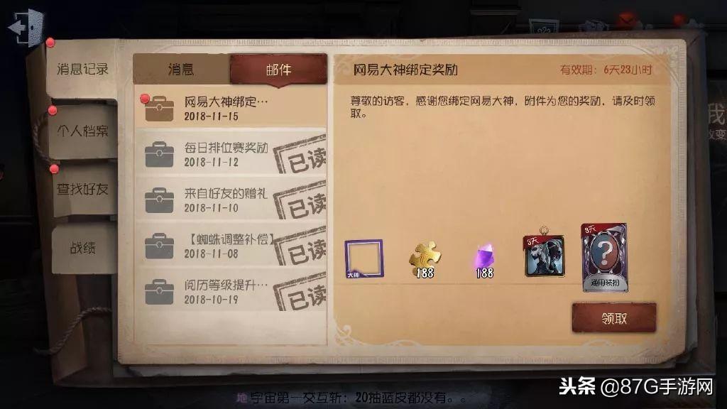 绑定角色后,上游戏就可以收到邮件。如果之前已经绑定过网易大神的玩家,需要解绑之后重新绑定就可以获得奖励,邮件可能会有延迟,各位玩家不要担心。