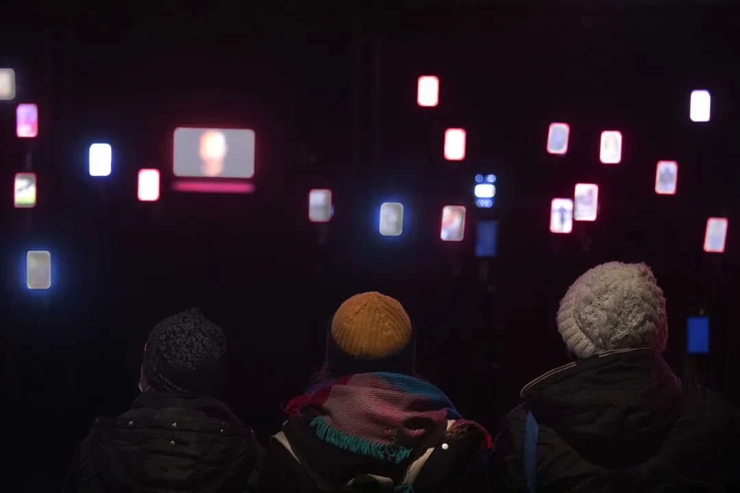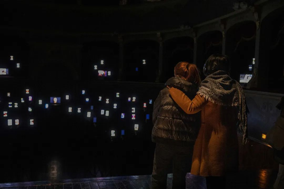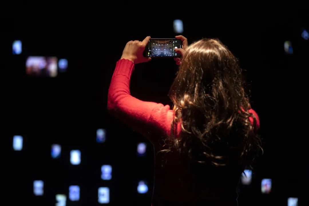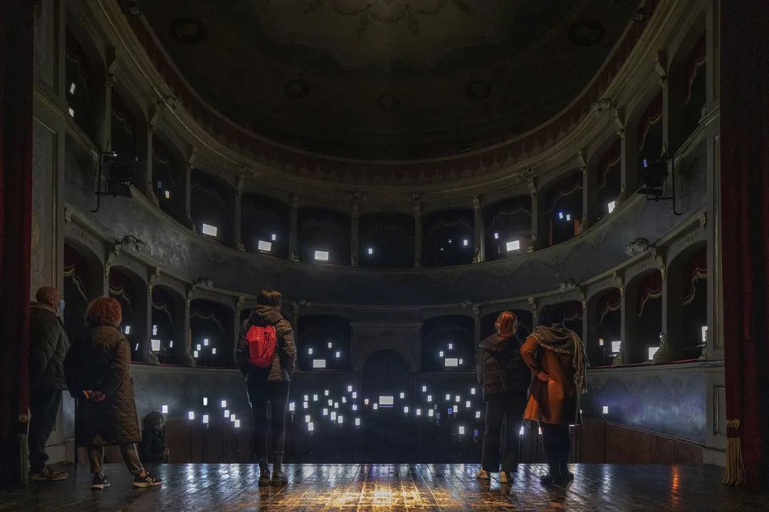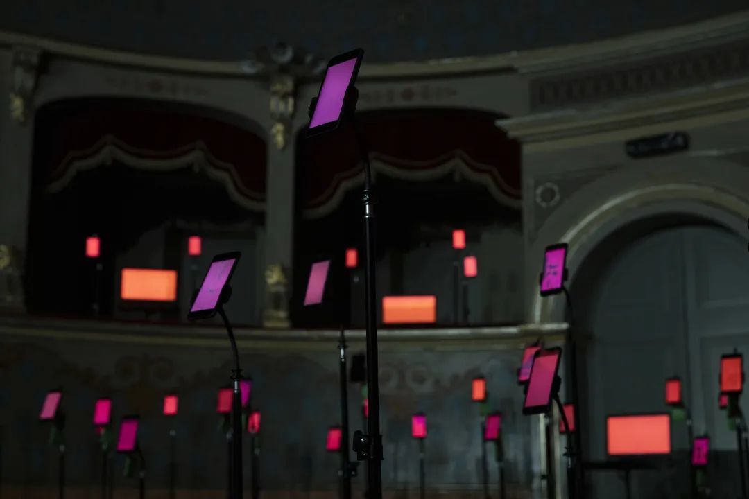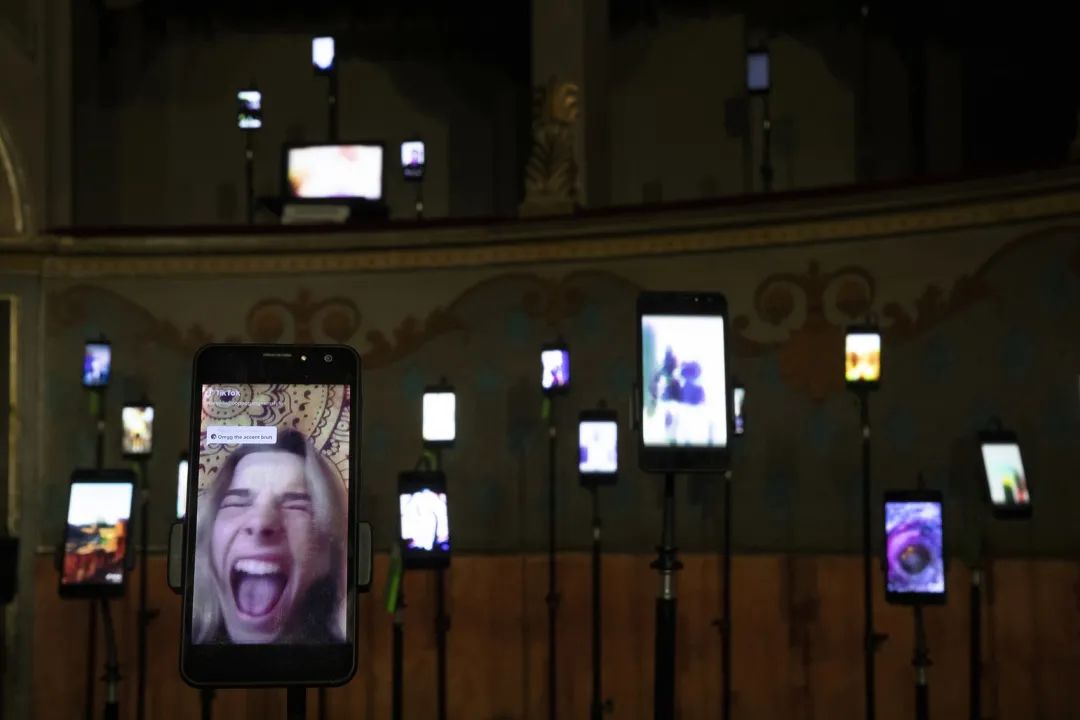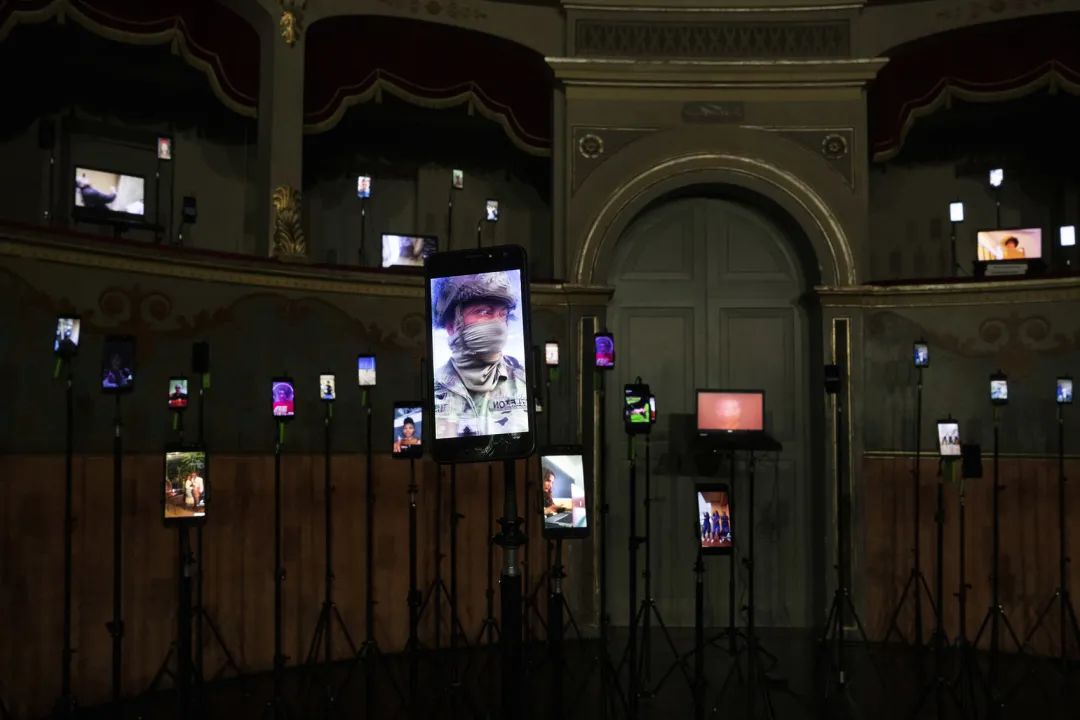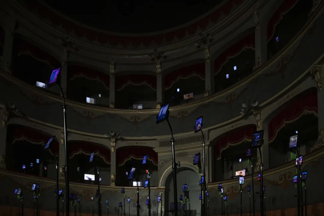 在意大利Longiano剧院的空间中,艺术家的介入颠覆了传统的视角,150个电子设备取代了观众的位置,而观众被邀请到舞台上接受着电子屏幕的审视。 每一部设备都会播放来自社交网络的不同视听内容;通过这些设备生成的内容,艺术家Magaldi向人们呈现出一座用声音与视觉刻画出的“雕塑”,而观众们则可以走到台下,置身于“雕塑”之中。设备中播放的内容都是由艺术家精心挑选出来的,旨在全面地展示出科技的光明与阴暗面;利用介于超现实和高度写实之间的讽刺性意象,模拟出真实的模仿传递行为模式。