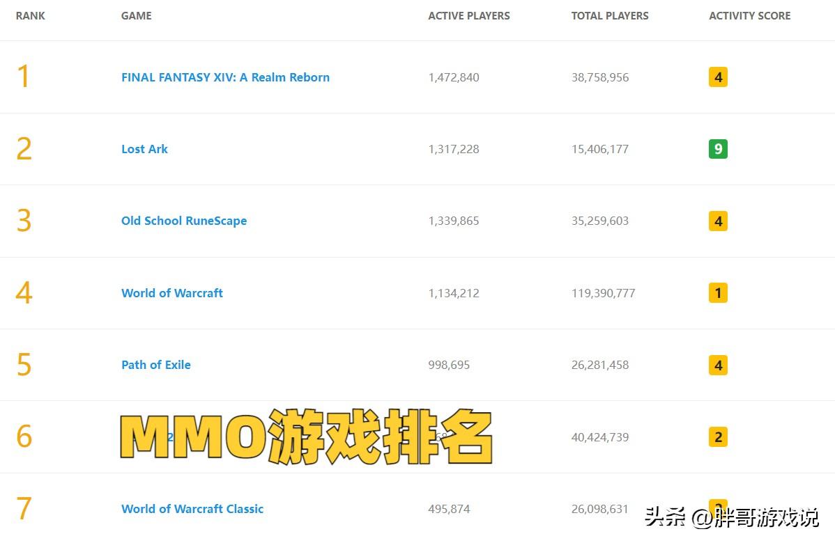 这是外服游戏平台统计的2022年MMORPG游戏的热度排名,可以看到排名第一的就是FF14,日常活跃玩家人数达到了140W以上。魔兽世界正式服排在第四位,虽然累计玩家数量达到了1亿以上,但是日常活跃玩家人数只有110W左右。