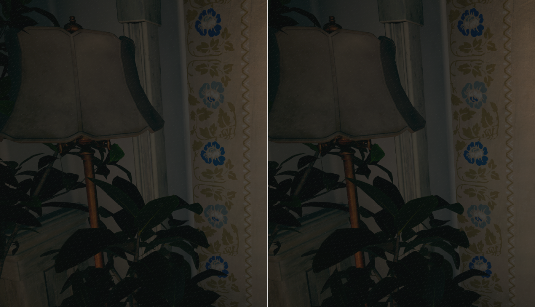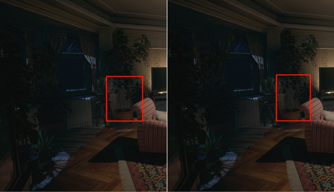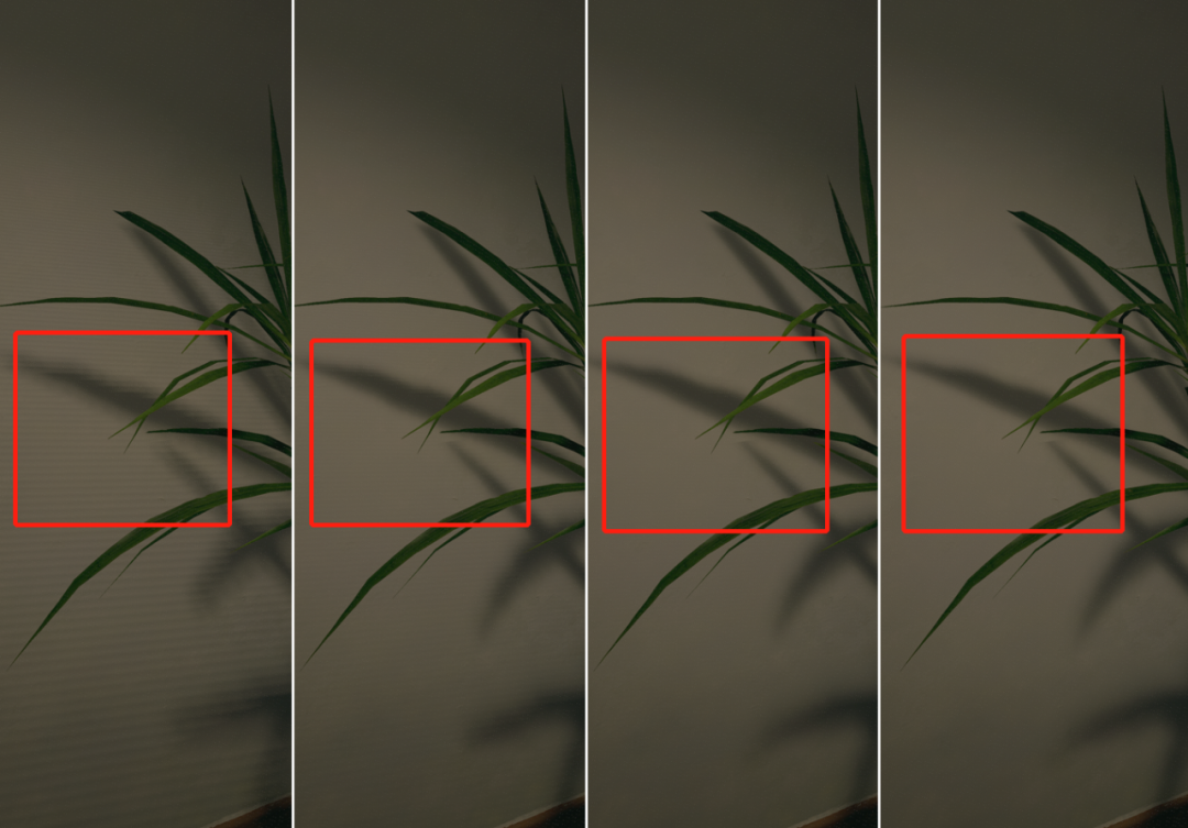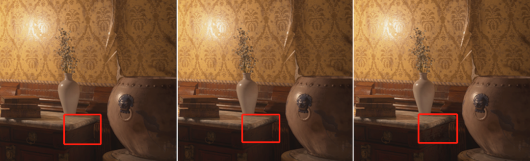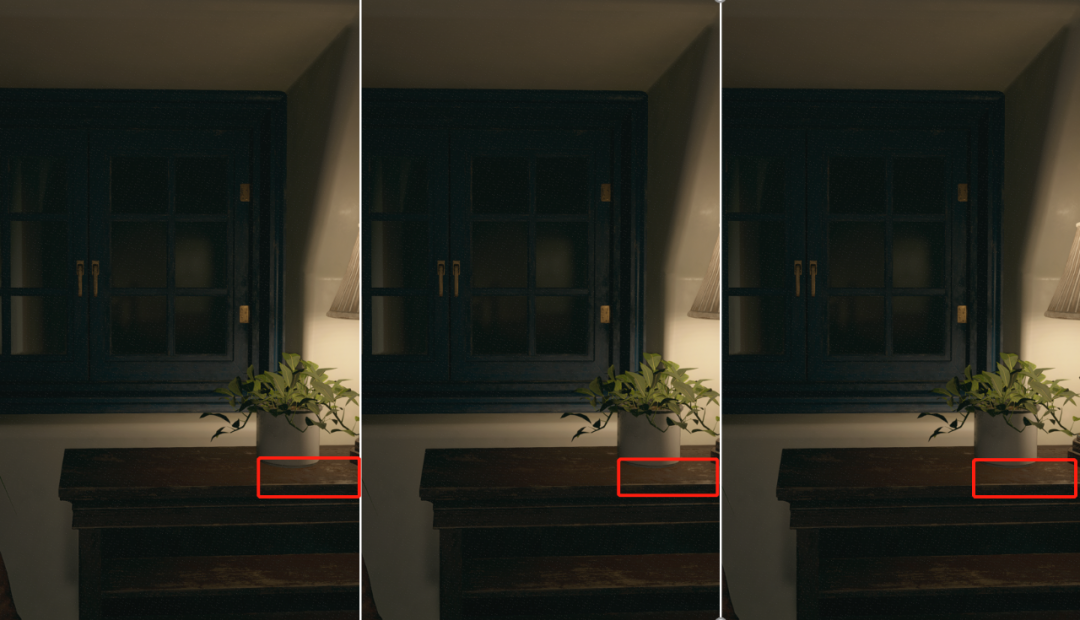 以上图场景为例,在隔行扫描下,盆栽反应在墙纸上的阴影相对于普通模式下没那么自然;其次在开启隔行扫描模式下可能会导致画面锯齿及抖动,这一现象在低分辨率下出现几率会增大。