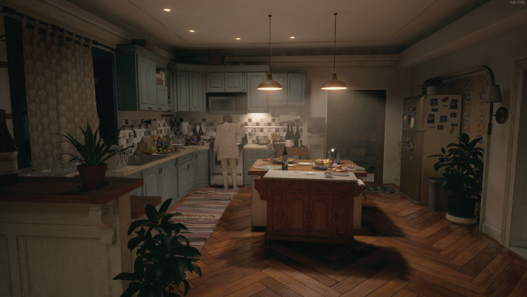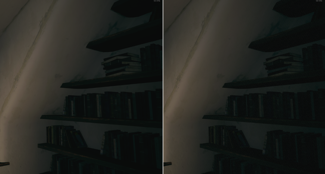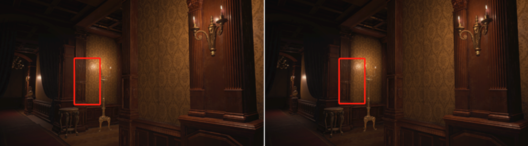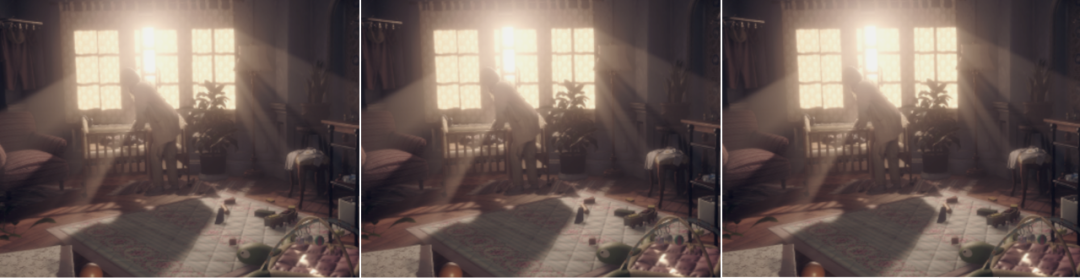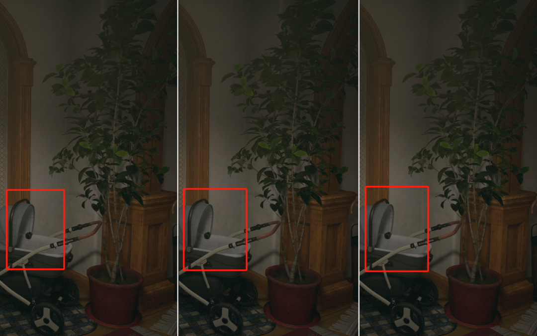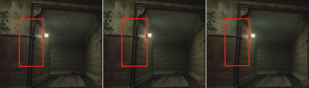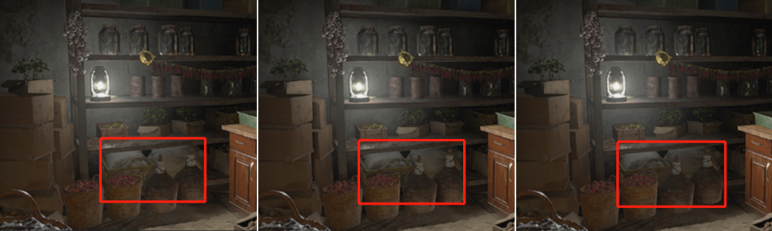 以上图场景为例,在隔行扫描下,盆栽反应在墙纸上的阴影相对于普通模式下没那么自然;其次在开启隔行扫描模式下可能会导致画面锯齿及抖动,这一现象在低分辨率下出现几率会增大。