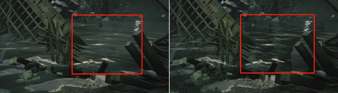 区别还是非常明显的,开启后水面可一定程度上反射周围情况,水的质感看上去也更好。