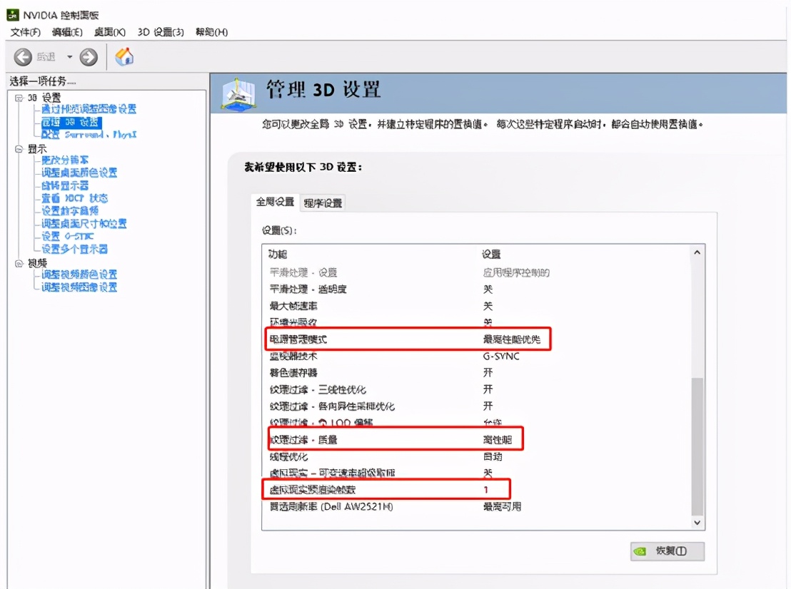 首先,玩家需要在桌面右键,点击NVIDIA控制面板,在管理3D设置的全局设置或程序设置中找到《生化危机8》游戏,将虚拟现实预渲染帧数设置为“1”;纹理过滤 – 质量设置为“高性能”;电源管理模式设置为“最高性能优先”,如上图所示,设置完成后点击应用。(建议玩家更新最新的NVIDIA显卡驱动,非RTX显卡可不更新)
