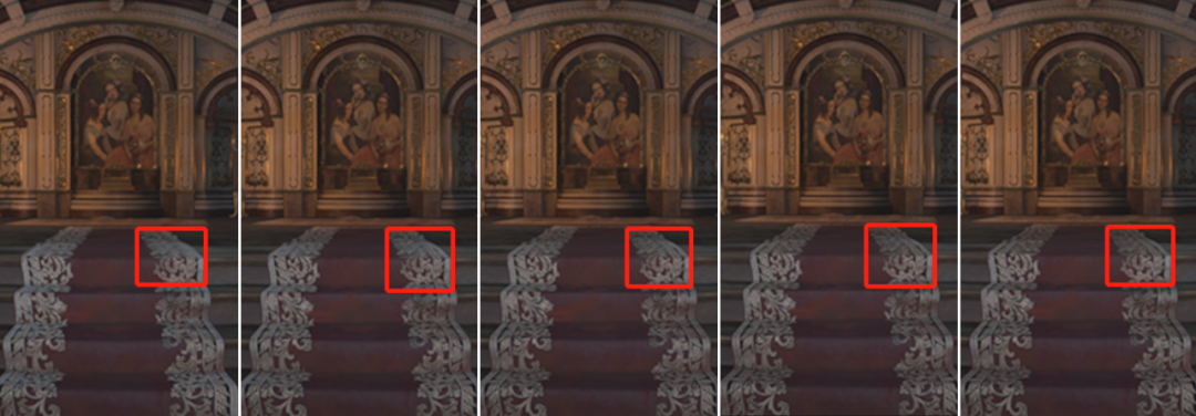 主要区别在于地毯的向后延伸处,如图红框所示,三线性过滤下,向后延伸部分地毯纹理的黑色分切线非常不明显。随着各向异性纹理的倍数提升,这一分切线才能清楚体现出来。