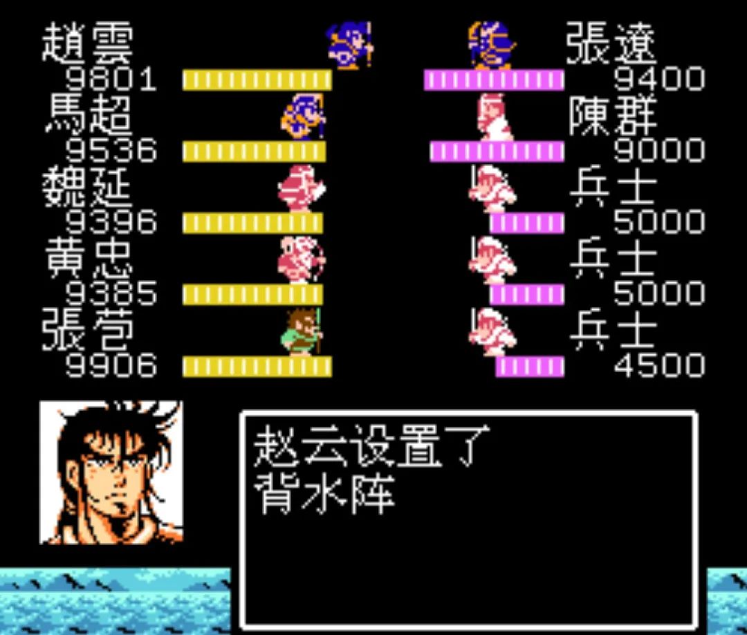 背水阵拥有全游戏最牛叉的攻击加成,然而在《吞食天地2》实际游戏中属实是第一大鸡肋阵型,先不说这个阵型跟静寂阵一样只能在战斗中布置,而且同样是一次性用品,最最要命的是这个阵型必须要在有水的地方才能设置,像一般的攻城战、平原遭遇战、哪怕是杂兵战等都是布置不了的。
