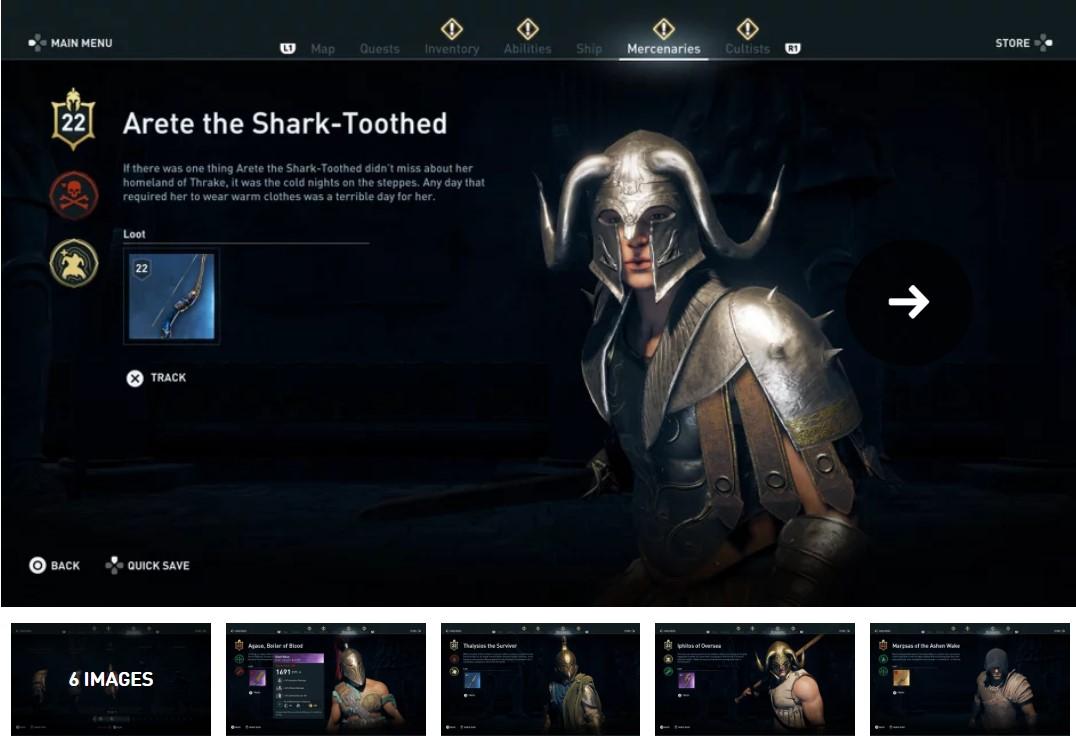 每一个雇佣兵都有优点和弱点,有自己独特的武器和属性,育碧借此希望和雇佣兵的每场战斗都有独特的挑战性。尽管你能在古希腊世界中找到大量手工打造的雇佣兵,但他们也会在故事和模块化战斗中随机产生,为玩家提供可以战斗的更多精英敌人。
