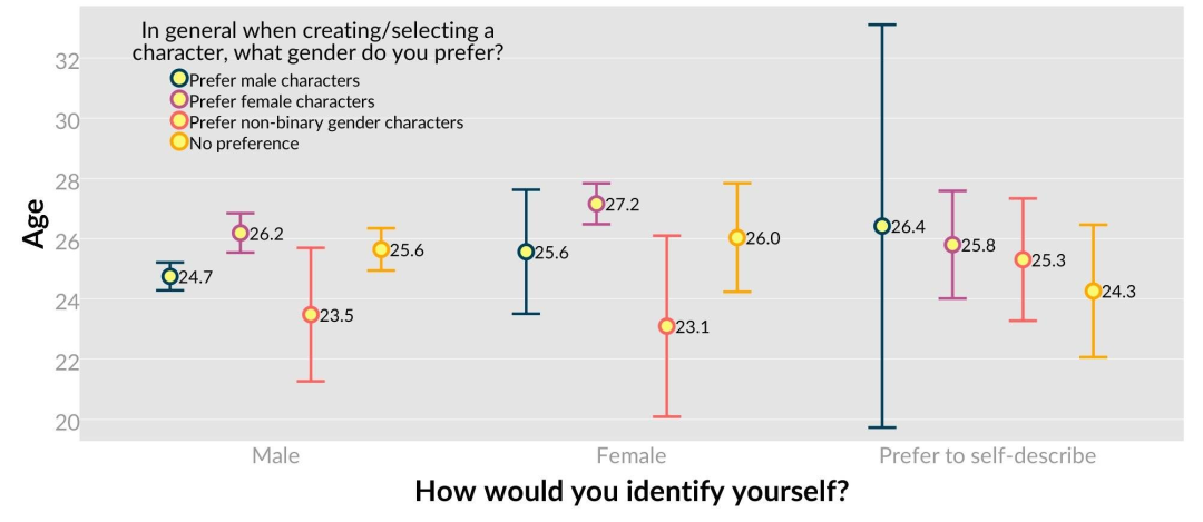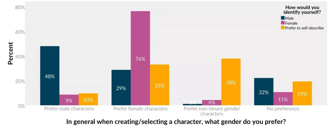 上个月,海外一家用户分析机构Quantic Foundry做了一个有趣的调查。他们发现在海外玩家中,除开中立派外有48%的男玩家喜欢使用男性角色,而有29%更喜欢女性角色。