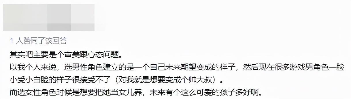 当然,在这份调查下面,也有不少玩家表示了无法理解,觉得男玩家用男角色才是“正道”。那么问题就来了,为什么那么多人热衷于在游戏中选用女性角色,但又有人对此嗤之以鼻呢?
