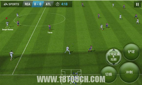 至于虚拟按键则分为经典和休闲(休闲模式就是FIFA 14中的滑动屏幕的操作模式,实在是太鬼畜了小编根本玩不动,还是推荐经典模式好啊...)两种,之间的区别就是键位发生了互换。另外本作的按键有相当清晰的功能注明,而且字体和按键的大小都有改善,摇杆可以是固定,也可以是浮动,操作和显示内容的人性化调整不少,从整体来讲,操作舒服多了,球员的脚法也得以更好地展现。
