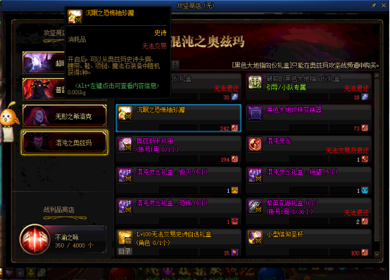 奥兹玛属于当前100级版本最高团本,当前这个版本还是比较坑的随机版本,使用辛辛苦苦打团攒够的242混沌灵念,换取的沉眠之恐怖袖珍罐,还是随机获得一件,相当坑爹。回归玩家想要快速毕业一套奥兹玛装备,除了通过通关奥兹玛团本获得的混沌灵念换取沉眠之恐怖袖珍罐,以及金牌获得奥兹玛装备之外,还可以通过以下方式,快速获得混沌灵念以及奥兹玛装备随机罐子,快速毕业一套奥兹玛装备。(注:泰玛特套装目前最强的一套)