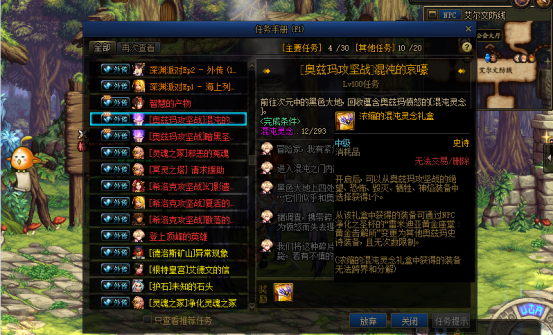 点击任务然后点击外传,找到【奥兹玛攻坚战】混沌的哀嚎,293个混沌灵念可以换取一个浓缩的混沌灵念礼盒,可以指定获取一件奥兹玛百变怪装备,该礼盒的奥兹玛装备可通过NPC净化之圣杯消耗混沌灵念转换成其他奥兹玛装备。注:净化之圣杯位置在切斯特小镇。一般是4等1的时候再做这个,个人看法。