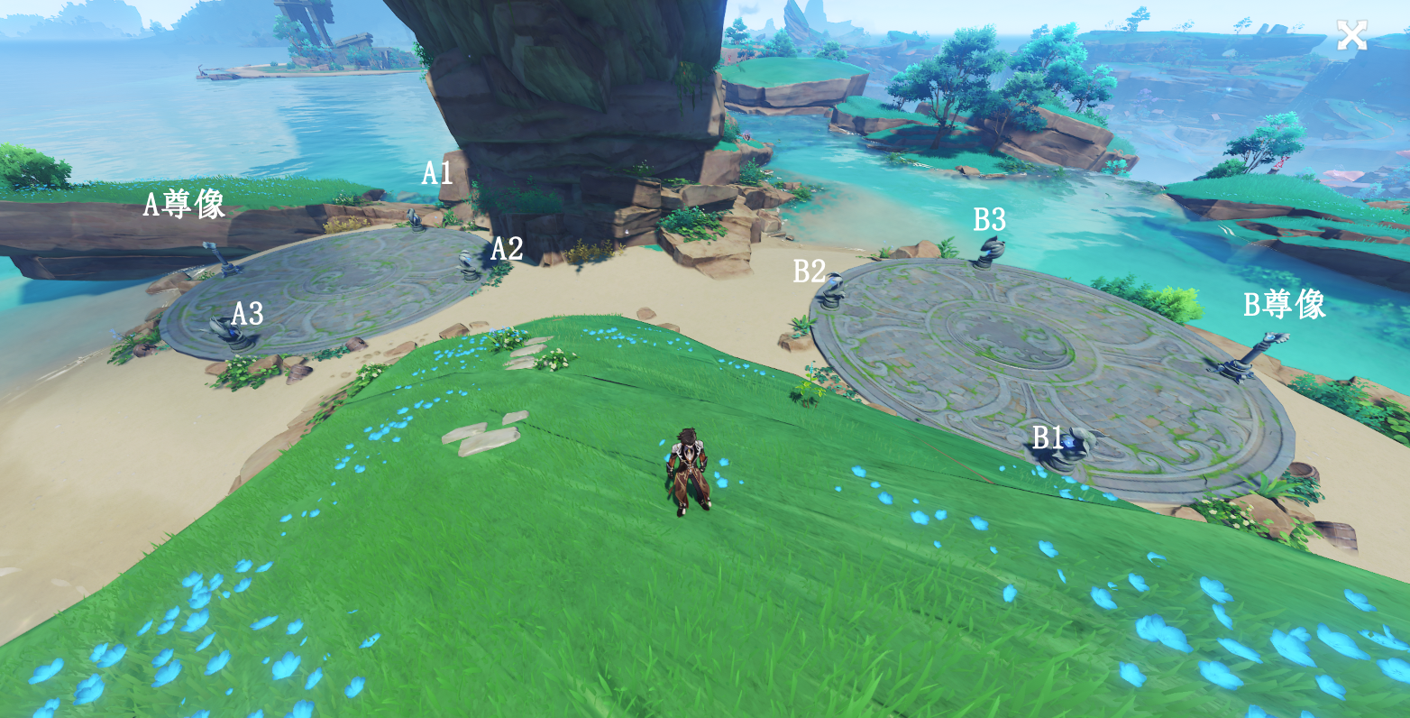 (2)解除「鳍」处的封印,这个封印的解法就是让两个圆盘中的所有雕像朝向圆盘中心,AB雕像是转动是联动的,可以通过激活海祗尊像来固定一边的雕像,先把A位置那边的雕像全部调对位置,然后激活A处的海祗尊像固定雕像,再调整B处就可以了,