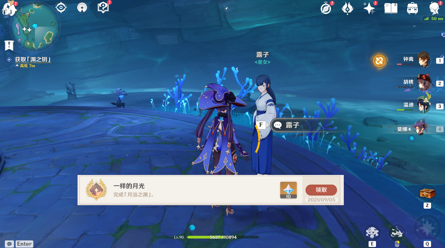 (4)破解完后,来到中间圆盘位置拿取「渊之匙」,与露子对话,任务完成获得奖励并且同时获得成就【一样的月光】10原石。