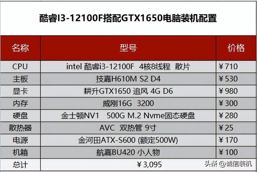 i3 12100F号称游戏小钢炮,搭配GTX1650显卡在1080P下用来应付《绝地求生》、《永劫无间》、《APEX英雄》、《英雄联盟》、《鬼泣5》、《GTA5》之类的游戏,或者以下级别的3D网络游戏还是足够的。不过对于像《刺客信条:奥德赛》、《巫师3:狂猎》、《古墓丽影:暗影》之类的单机大作,在1080P高画质基本搞不定,需要降低一定的画质才可以畅玩。