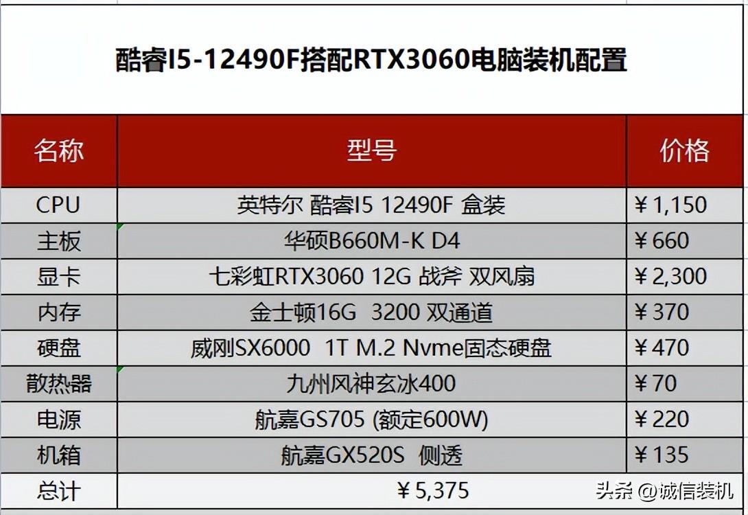 i5-12490F,定位中端,不带有独显,为6个P核,12线程,三级缓存20MB,单核基础频率3.0GHz,单核睿频4.6GHz,65W功耗 搭配七彩虹RTX3060在2K分辨率下不惧任何主流游戏,并且此配置是目前比较热门得主流游戏电脑配置。