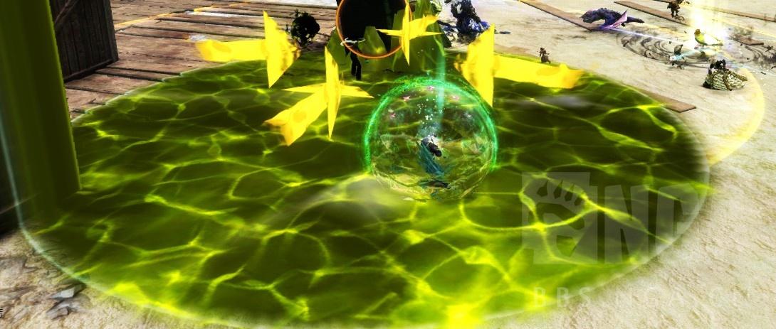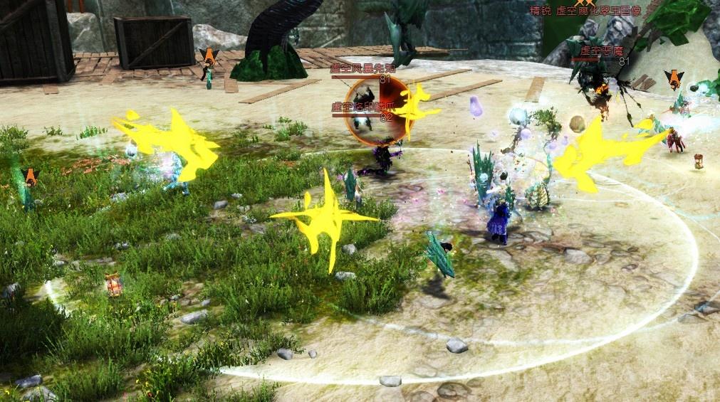 如图:地面有个拾取标识的就是反射水晶。地面有箭头指引的范围就是充能技能,圈中的读秒表示释放时间,地面变绿以后就充能完成,按2技能把水晶砸向BOSS。